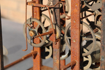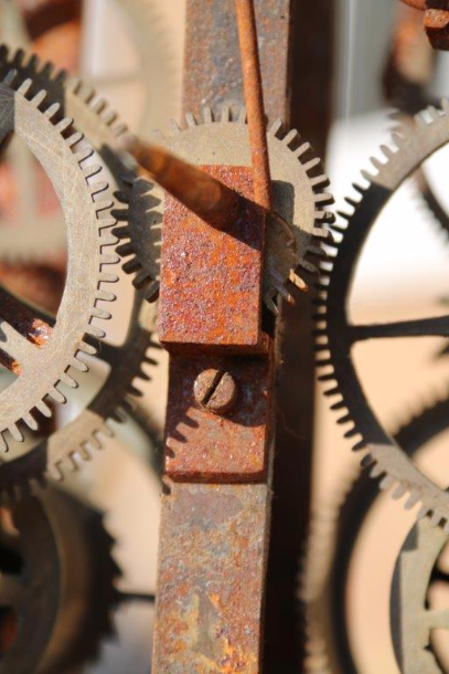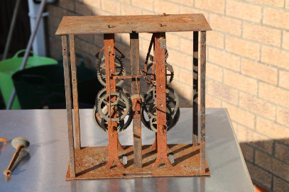 'Comtoise Morbier' Clock Movement, circa 1750, in poor rusting condition, ready for restoration. I try and use antiques and vintage pieces in my Sculptures. They already have history and their own unique stories.