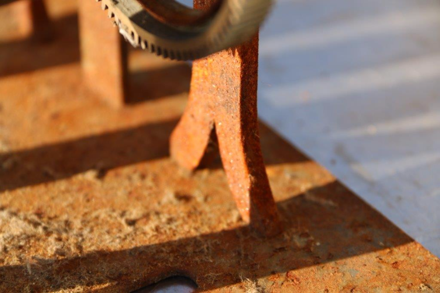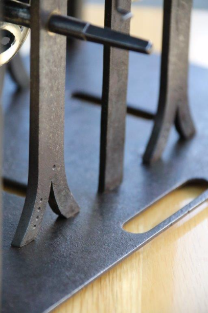 Metal work, cleaned then sprayed with dry silicone, to seal the steel from rusting and to give it a patinated, old industrial appearance.