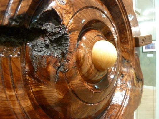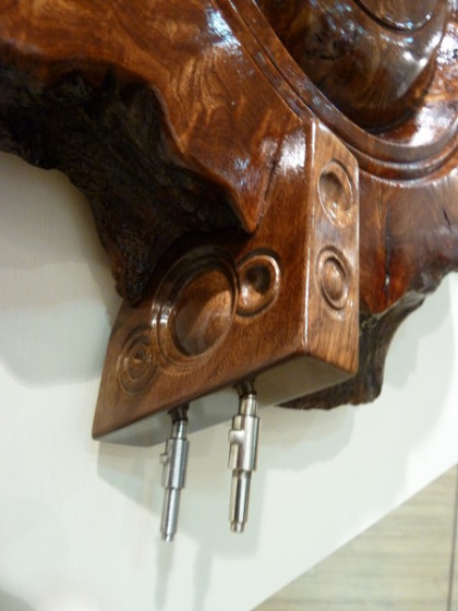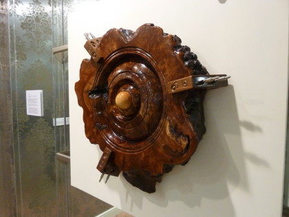 This is a wall sculpture made from a large piece of beautiful natural edged Burr Elm, Amerillo and Steel.